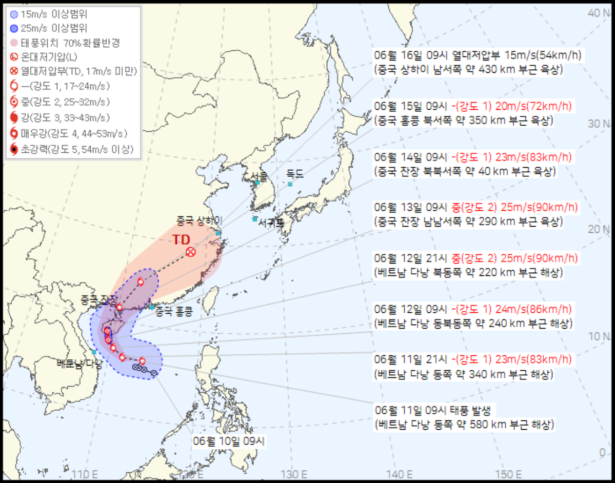 현재 태풍은 필리핀 부근 해상에서 중국 남부를 향해 느리게 북서진하고 있습니다. 기상청의 주요 예측 모델에 따르면, 우딥은 6월 13일경 중국 하이난성을 거쳐 중국 남부(잔장 등)에 상륙한 뒤, 힘을 잃고 내륙으로 이동하다가 15~16일경에는 열대저압부로 약화되어 소멸할 것으로 보입니다.