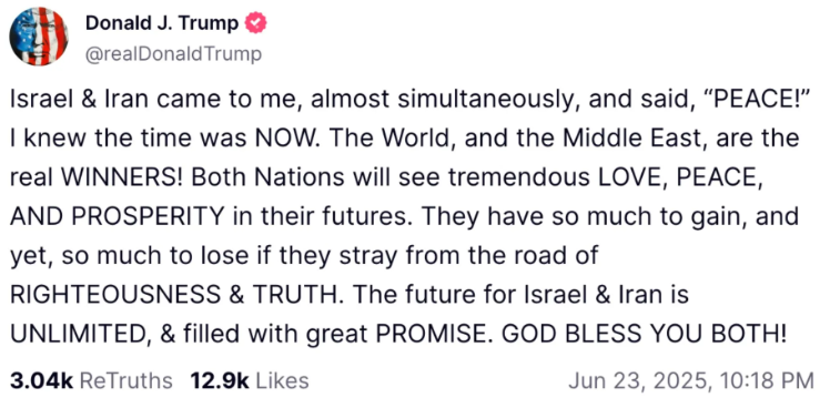 이란의 예고된 보복이 끝나자마자, 트럼프 대통령은 자신의 소셜미디어 트루스소셜을 통해 세기의 선언을 합니다. 이란과 이스라엘 간에 완전하고 전면적인 휴전이 합의되었다!