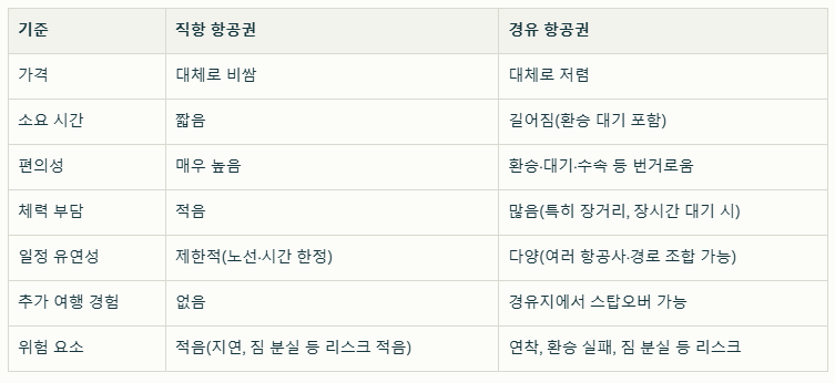 경유 : 가격이 직항보다 20~50% 저렴할 수 있습니다. 시간적 여유가 있고, 경유지에서 잠깐의 추가 여행(스탑오버)을 즐기고 싶은 예산 중시 여행자에게 안성맞춤이죠.