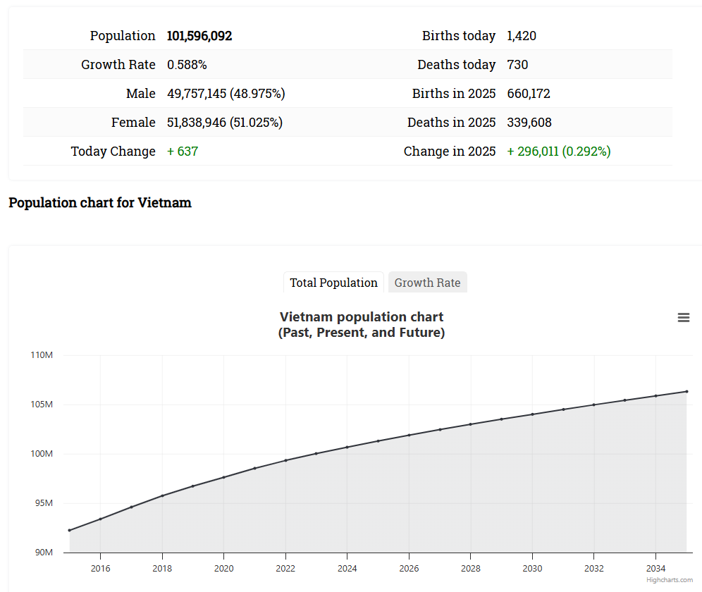 둔화되는 인구 증가율 : 한때 폭발적인 인구 증가를 보였던 베트남의 연평균 인구 증가율은 최근 0.6%대까지 떨어졌습니다. 2023년 약 83만 명이던 연간 인구 증가 수는 2025년에는 약 60만 명 수준으로 감소할 것으로 보입니다.