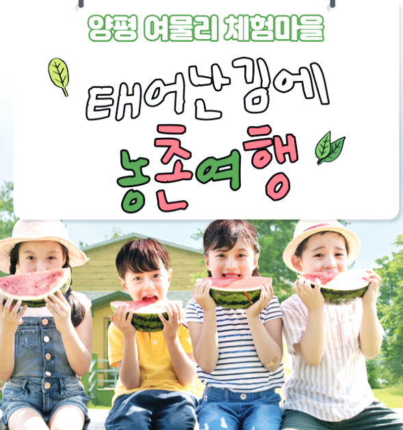 주요 활동 : 북한강과 남한강이 만나는 아름다운 두물머리에서 강변 산책을 즐기고, 시원한 물놀이를 하거나 자전거를 타며 여유를 만끽합니다. 그리고 아이들과 함께 농촌체험마을에서 과일 따기, 전통 음식 만들기, 도자기 체험 등 계절별로 다양한 농촌 체험을 하며 자연과 교감하는 특별한 시간을 보낼 수 있습니다.