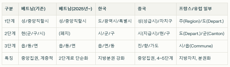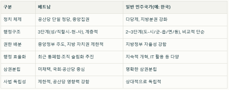 지방정부 : 베트남은 58개 성(province)과 5개 중앙직할시(하노이, 호찌민 등)로 나뉩니다. 각 지방에는 행정을 담당하는 인민위원회와 지방의회 격인 인민의회가 있지만, 이들 역시 중앙정부와 공산당의 강력한 통제를 받습니다. 주요 정책과 예산, 인사는 모두 중앙에서 결정됩니다.