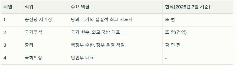 베트남의 국가 운영은 흔히 4대 기둥(Four Pillars)이라 불리는 집단지도체제에 의해 이루어집니다. 4명의 최고 지도자가 권력을 나누어 맡는 형태이지만, 그 안에는 분명한 서열과 역할의 차이가 존재합니다.