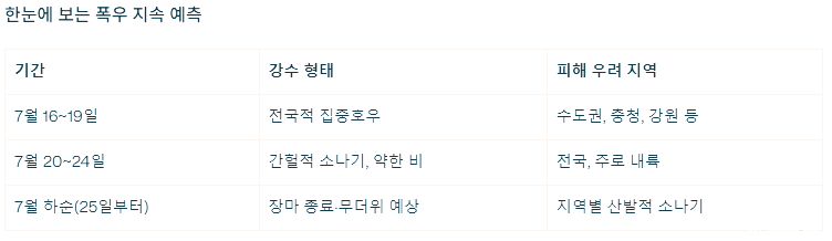 기상청과 전문가들은 현재의 집중호우가 7월 19일(토)까지를 최대 고비로 보고 있습니다. 특히 수도권과 충청, 강원 등 중부지방을 중심으로 매우 강하고 많은 비가 예보되어 있어, 주말까지는 긴장의 끈을 놓아서는 안 됩니다. 산사태나 축대 붕괴, 저지대 침수 등 추가적인 피해 발생 가능성이 매우 높은 시기이므로 각별한 주의가 필요합니다.
