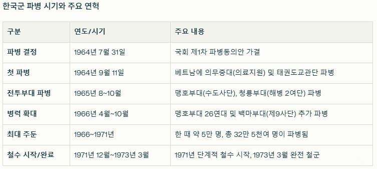 1964년 의료지원단 파견을 시작으로, 1965년부터는 맹호·청룡·백마부대 등 전투부대가 본격적으로 투입되었습니다. 1973년 철수까지 연인원 32만 5천여 명의 한국군이 베트남 땅을 밟았습니다.