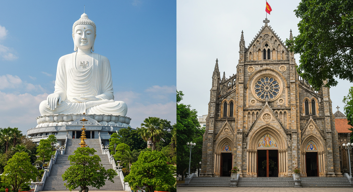 - 나트랑 대성당 (Nha Trang Cathedral): 프랑스 식민지 시절인 1928년, 루이 발레 신부의 주도로 지어진 고딕 양식의 석조 성당입니다. 언덕 위에서 도시를 굳건히 지키는 듯한 모습이 인상적이죠. 유럽의 어느 도시에 와 있는 듯한 착각을 불러일으키는 스테인드글라스와 장미 창문, 높은 종탑은 프랑스 식민지 시대의 유산이자 나트랑 가톨릭 신앙의 중심지로서 그 의미가 깊습니다.