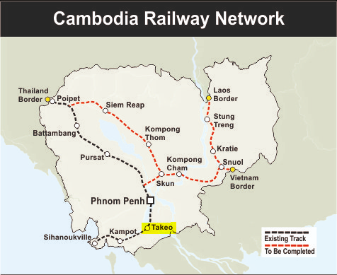 씨엠립 출발: 씨엠립에서 타케오로 가기에는 거리가 꽤 멀다(약 500km). 버스로는 7시간 이상 걸리므로, 항공편으로 프놈펜까지 이동한 후 육로 교통을 이용하는 것이 더 효율적이다. 위의 지도와 같이 도는 것이 좀 더 여행 시 피로를 줄일 수 있는 방법이다.