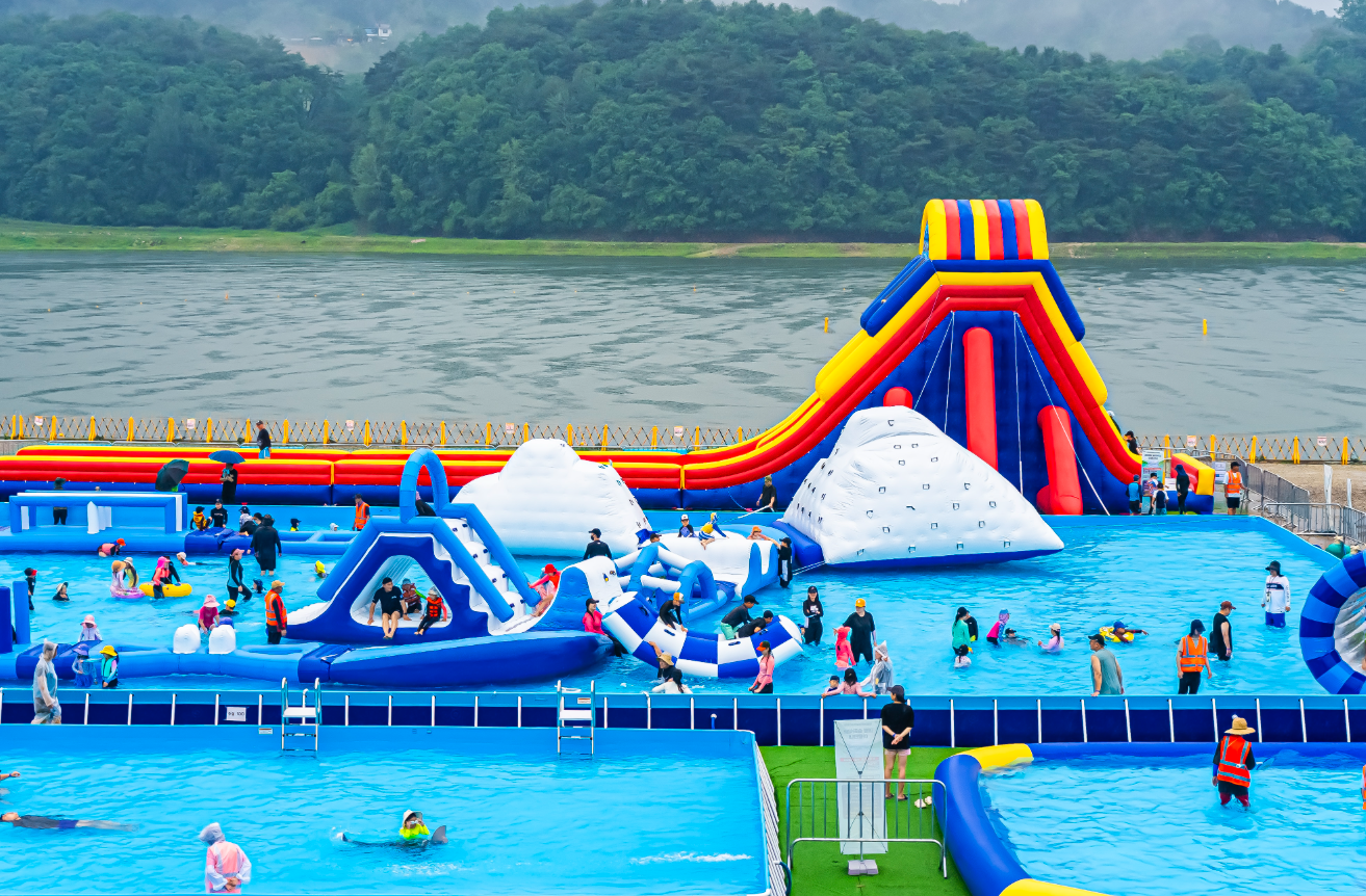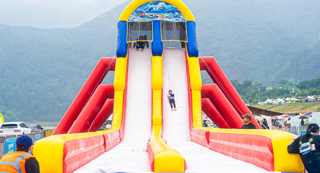 이번 축제의 심장과도 같은 곳이죠. 무려 1,300평 규모의 대형 물놀이장이 펼쳐집니다. 보기만 해도 아찔한 높이의 워터슬라이드와 통통 튀는 재미가 있는 워터바운스는 기본! 아이들을 위한 얕은 풀부터 어른들도 스릴을 느낄 수 있는 챌린지 풀까지 완벽하게 갖추고 있어 온 가족이 함께 즐기기에 부족함이 없습니다. 강원도 여름 축제 중 이 정도 규모의 물놀이장은 정말 찾기 힘들 거예요!
