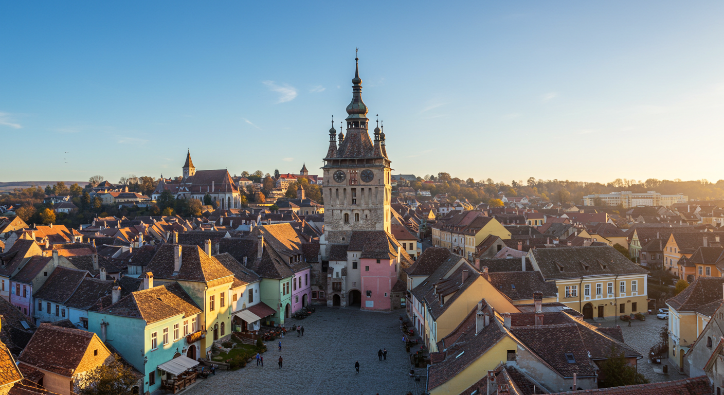 시기쇼아라 (Sighișoara) 구시가지 산책: 알록달록한 파스텔톤 건물과 자갈길이 아름다운 유네스코 세계문화유산입니다. 시계탑에 올라 그림 같은 마을 전경을 한눈에 담아보세요.