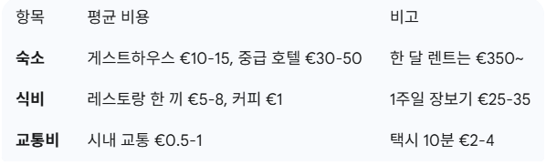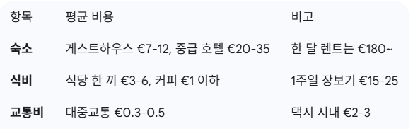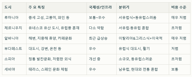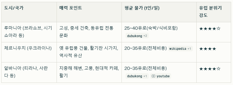 - 공통점: 세 곳 모두 한 달 100만 원 내외의 예산으로 충분히 생활 가능하며, 서유럽 못지않은 '진짜 유럽 감성'을 느낄 수 있습니다.