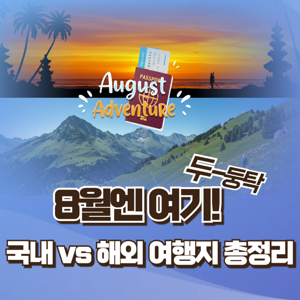 안녕하세요! 여러분의 여행 메이트, 박스피군입니다. 찌는 듯한 더위가 한풀 꺾이고, 늦여름의 정취가 물씬 풍기는 8월! 막바지 여름휴가를 계획하고 계신 분들이 많으실 텐데요. "어디로 가야 잘 갔다고 소문이 날까?" 고민하는 여러분을 위해 국내부터 해외까지, 후회 없는 8월 여행지 추천 리스트를 엄선해왔습니다.