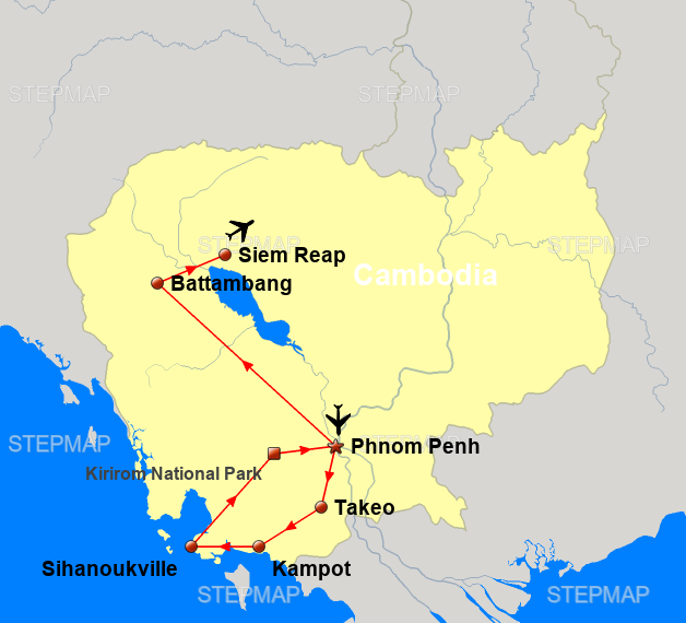 씨엠립 출발: 씨엠립에서 타케오로 가기에는 거리가 꽤 멀다(약 500km). 버스로는 7시간 이상 걸리므로, 항공편으로 프놈펜까지 이동한 후 육로 교통을 이용하는 것이 더 효율적이다. 위의 지도와 같이 도는 것이 좀 더 여행 시 피로를 줄일 수 있는 방법이다.