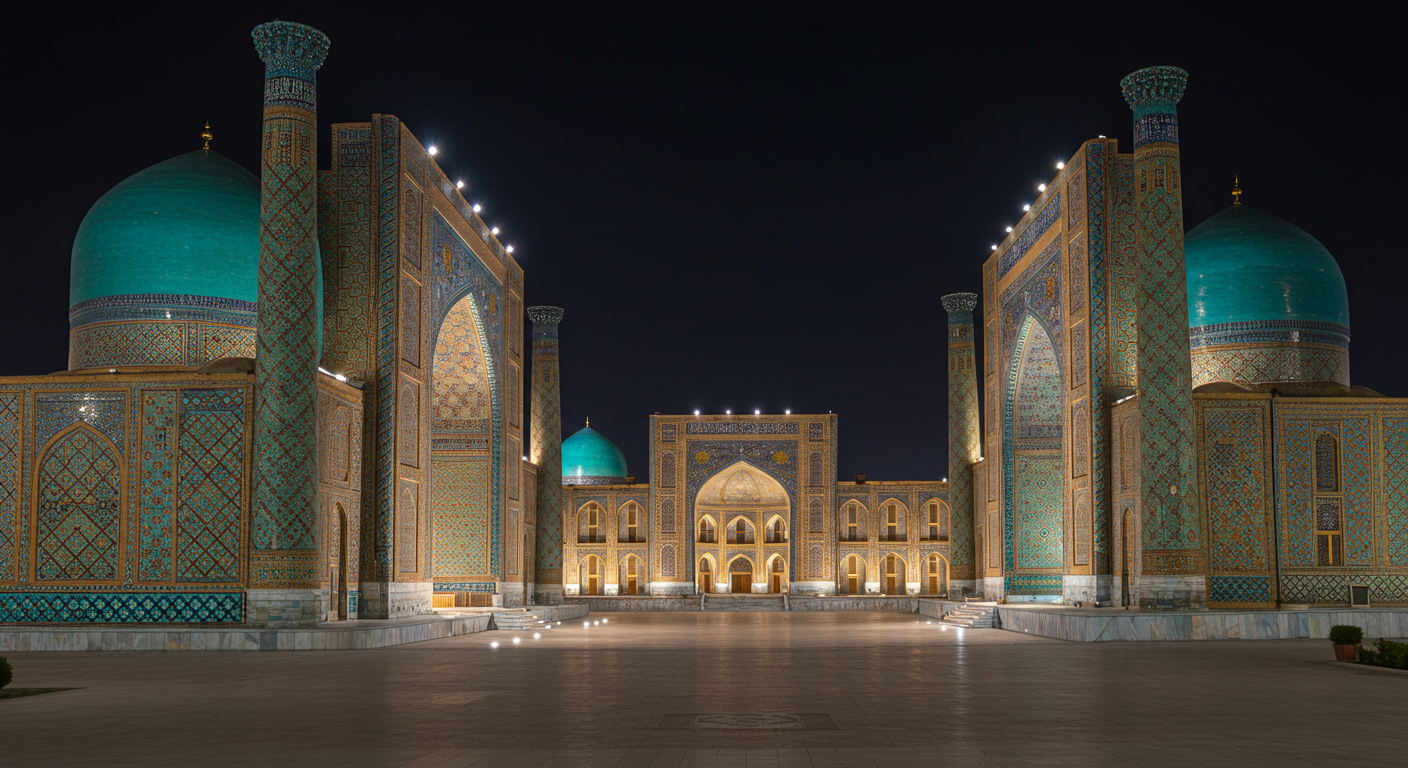 - 사마르칸트 : 해가 진 뒤 조명이 켜진 레기스탄 광장에서 인생 사진 남기기