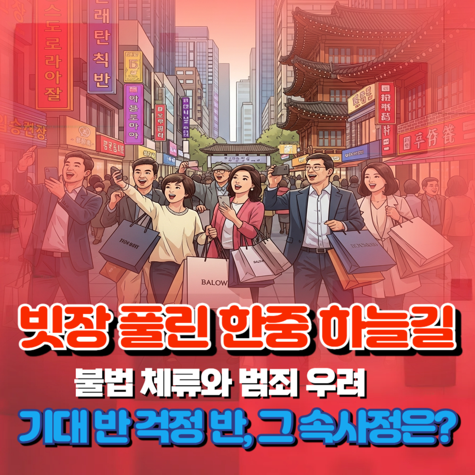 하지만 동시에, 많은 국민들의 마음속에는 불안의 그림자가 드리운다. 과연 우리는 이들을 맞이할 준비가 되었는가? 대한민국이 중국인 단체 관광객에게 한시적 무비자 입국이라는 빗장을 활짝 열어젖히면서, 우리 사회는 지금 기대와 우려의 교차로에 서 있다. 이것은 침체된 경제를 살릴 황금 열쇠일까, 아니면 걷잡을 수 없는 사회 문제를 야기할 판도라의 상자일까? 오늘, 우리는 한중 무비자 정책의 두 얼굴을 깊이 들여다본다.