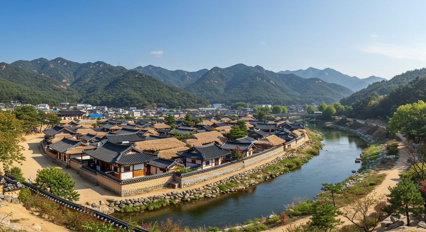 안동 하회마을은 유네스코 세계문화유산으로 지정된, 600년 역사의 유교 문화가 살아있는 한국 전통 마을입니다.