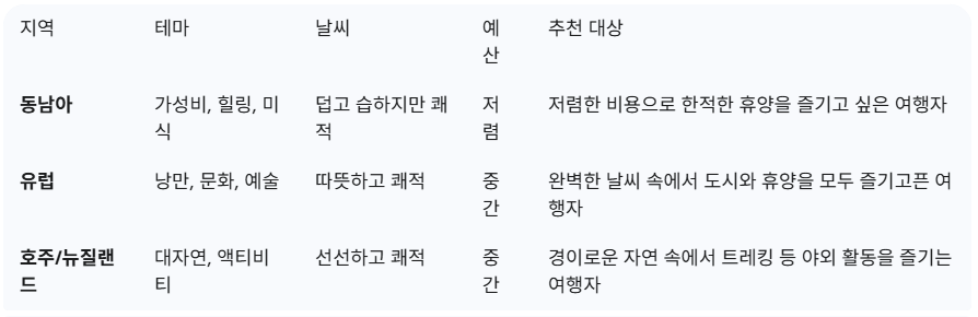 어디로 갈지 아직 고민된다면, 아래 표를 보고 나의 여행 스타일과 예산에 맞는 곳을 선택해 보세요!