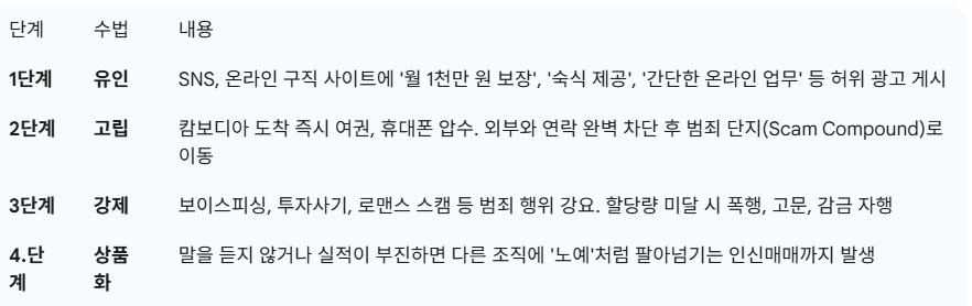 - 원인: 중국계 국제 범죄조직이 고수익을 미끼로 한국인을 유인, 온라인 사기 범죄에 강제 동원하고 있습니다.