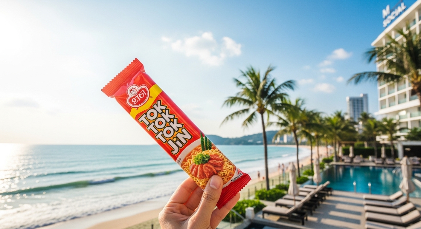 - 예시 2 (영상/릴스): 푸껫 빠통 비치에서 컵에 뜨거운 물을 붓고 진라면 스틱을 '톡톡톡' 털어 넣어 바로 즐기는 간편함 강조.