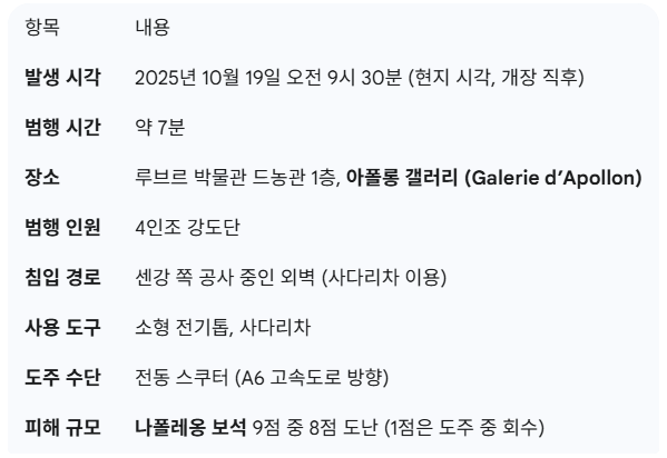 1. 사건: 2025년 10월 19일, 루브르 박물관 아폴롱 갤러리에서 나폴레옹 시대 보석 8점 도난.