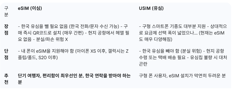 - 여행자는 'eSIM'이 정답. (한국 유심 유지 + 설치 간편)