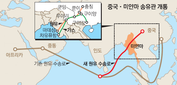 이러한 위치는 특히 중국에게 매우 중요한 곳인데, 중국은 에너지 수입의 상당 부분을 중동에 의존하며, 수입된 에너지는 대부분 말라카 해협을 통해 운송되고 있기 떄문이다. 만약 말라카 해협이 봉쇄되거나 통행에 문제가 생길 경우 중국 경제와 안보에 치명적인 타격을 입을 수 있는데, 이를 '말라카 딜레마'라고 부른다. 중국은 이 딜레마를 해소하기 위한 방안으로 미얀마에 주목하고 있고, 미얀마를 관통하는 송유관과 가스관을 건설하여 인도양의 항구(시트웨 항 등)에서 중국 내륙(윈난성)까지 에너지를 직접 수송하는 경로를 확보한 것이다. 이 경로는 말라카 해협을 우회함으로써 운송 거리를 획기적으로 단축하고 에너지 안보를 강화하는 효과를 가져왔으며, 도로, 철도 등 물류 인프라 건설을 수주받아 직접 개통하기도 하였다. 미얀마는 중국에게 인도양으로 나아가는 중요한 전략적 출구가 되고 있다는 것을 시사하는 부분이다.