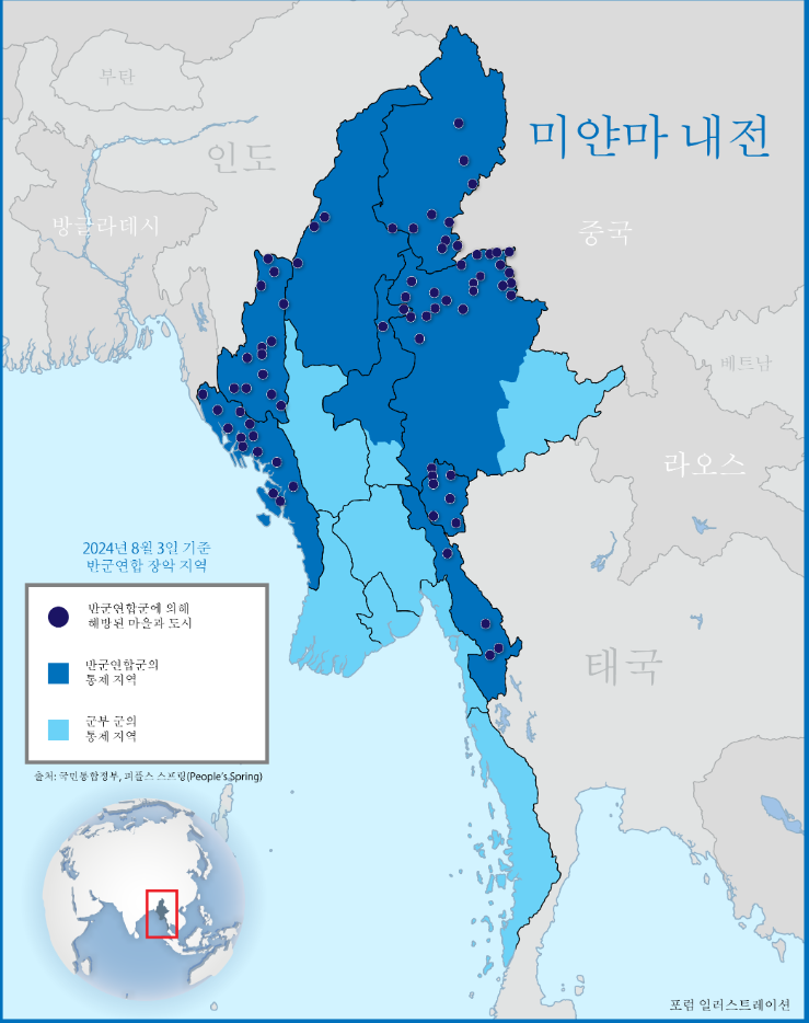 과거 미얀마의 무력 충돌은 주로 국경 지역의 소수민족 거주지에 국한되는 경향이 있었다. 하지만 2021년 쿠데타 이후 시작된 내전은 이제까지와의 무력 충돌과 양상이 달랐다. 버마족이 다수를 이루는 중부 평야지대와 대도시 인근까지 전투가 확산되었고, 소수민족 무장단체(EAO)와 새롭게 결성된 시민방위군(PDF)까지 연합하여 미얀마 군부에 맞서는 전국적인 전쟁으로 번지게 되었다.