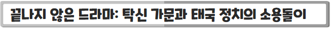 2000년대 이후 태국 정치는 '탁신'과 떼려야 뗄 수 없는 관계였다. 한 가문이 이토록 오랫동안 정치의 중심에 서 있는 것은 정말 이례적인 현상이었다.